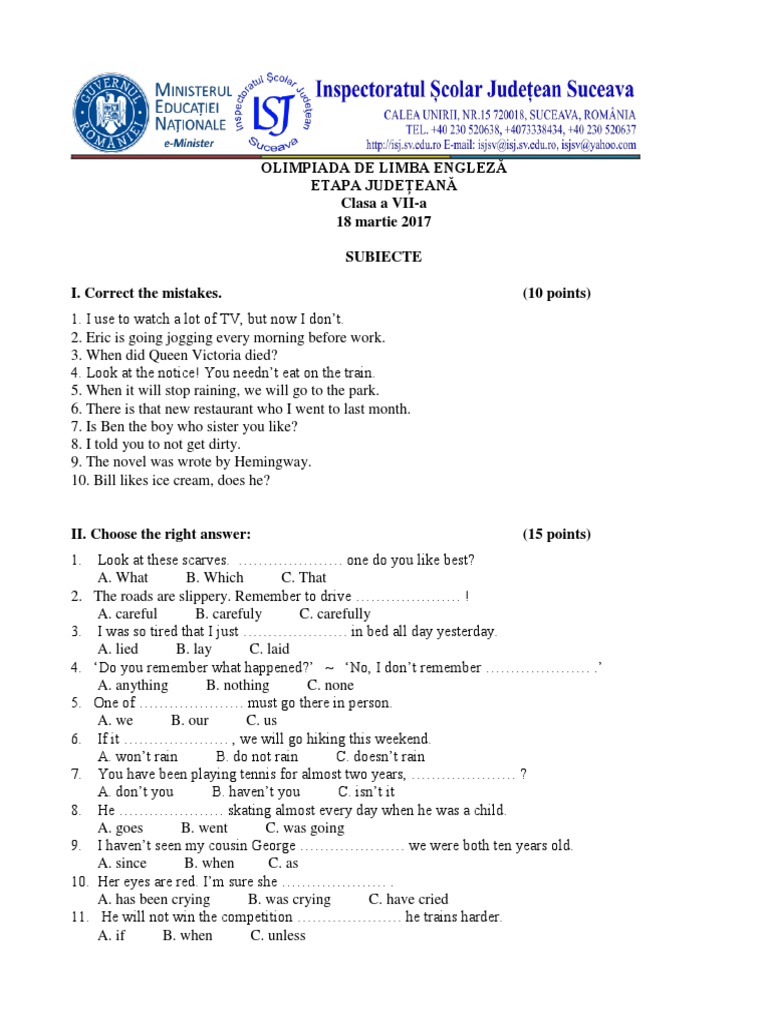 Subiecte Olimpiada Limba Engleza Clasa A 7 A Linguistic